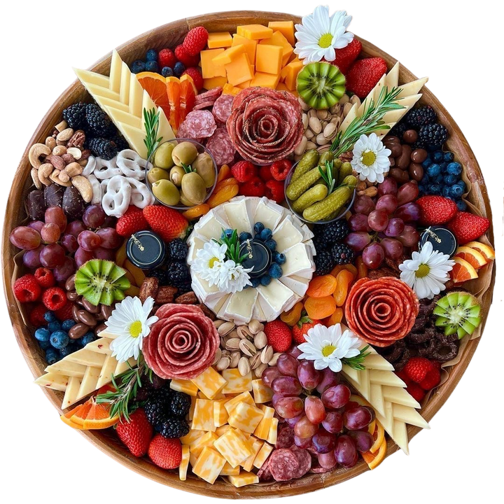 Designed for big celebrations, this board offers an array of cheeses, charcuterie, fruits, nuts, jams, and crackers to delight everyone.
